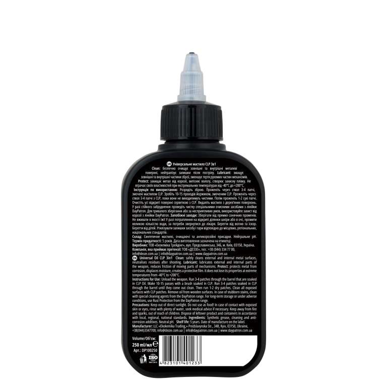 CLP 3в1 для застосування в польових умовах, завдяки високим властивостям проникнення, швидко та безпечно очищає, змащує та захищає всі зовнішні і внутрішні металеві поверхні. Призначений для всіх видів нарізної та гладкоствольної зброї малого та великого калібру. Захищає металеві поверхні від кліматичних і механічних впливів, має змащувальний ефект для захисту від тертя, підтримуючі робочий стан зброї. Не втрачає своїх властивостей при екстремальних температурах від -40С° до +200С°. Нейтралізує кислотні залишки від пороху, видаляє смолисті відкладення, легкий наліт свинцю, міді і томпаку, витісняє вологу.