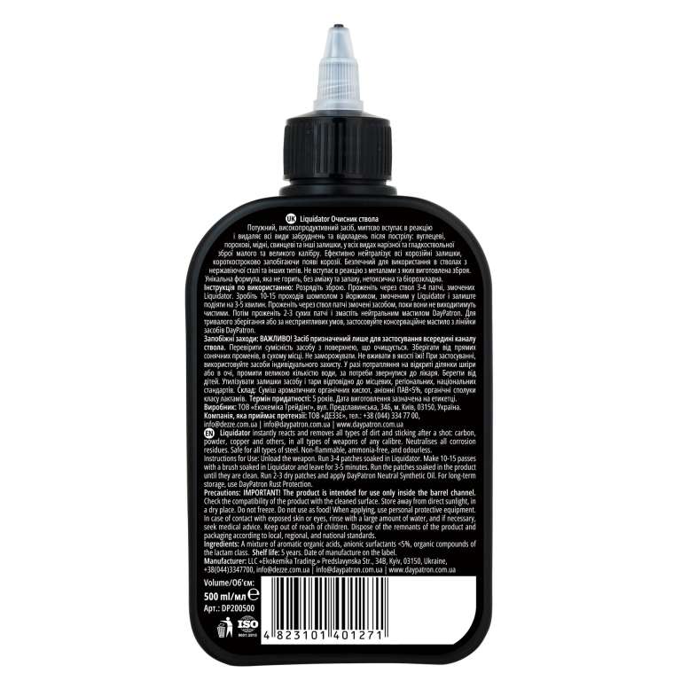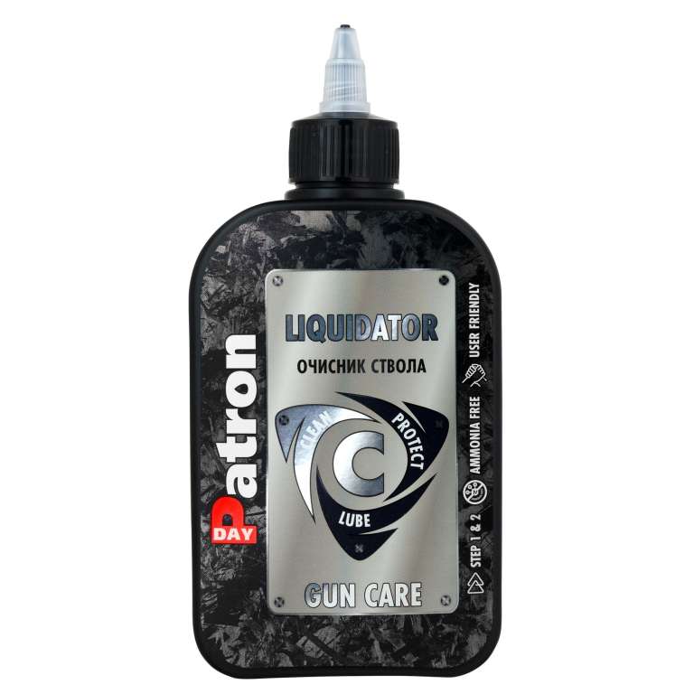 Ліквідатор - Потужний, високопродуктивний засіб, миттєво вступає в реакцію і видаляє всі види забруднень та відкладень після пострілу: вуглецеві, порохові, мідні, свинцеві та інші залишки, у всіх видах нарізної та гладкоствольної зброї малого та великого калібру. Ефективно нейтралізує всі корозійні залишки, короткостроково запобігаючи появі корозії. Безпечний для використання в стволах з нержавіючої сталі та інших типів. Не вступає в реакцію з металами з яких виготовлена зброя. Унікальна формула, яка не горить, без аміаку та запаху, нетоксична та біорозкладна.