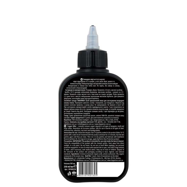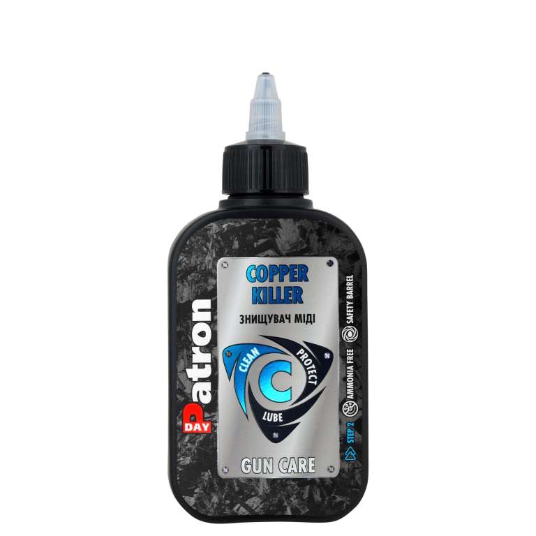 Знищувач міді - миттєво вступає в реакцію і видаляє відкладення міді та її сполуки після пострілу, у всіх типах зброї, малого та великого калібру. Ефективно нейтралізує будь-які корозійні залишки, короткостроково запобігаючи появі іржі та корозії. Безпечний для використання в стволах з нержавіючої сталі та інших типів. Не вступає в реакцію з металами з яких виготовлена зброя.