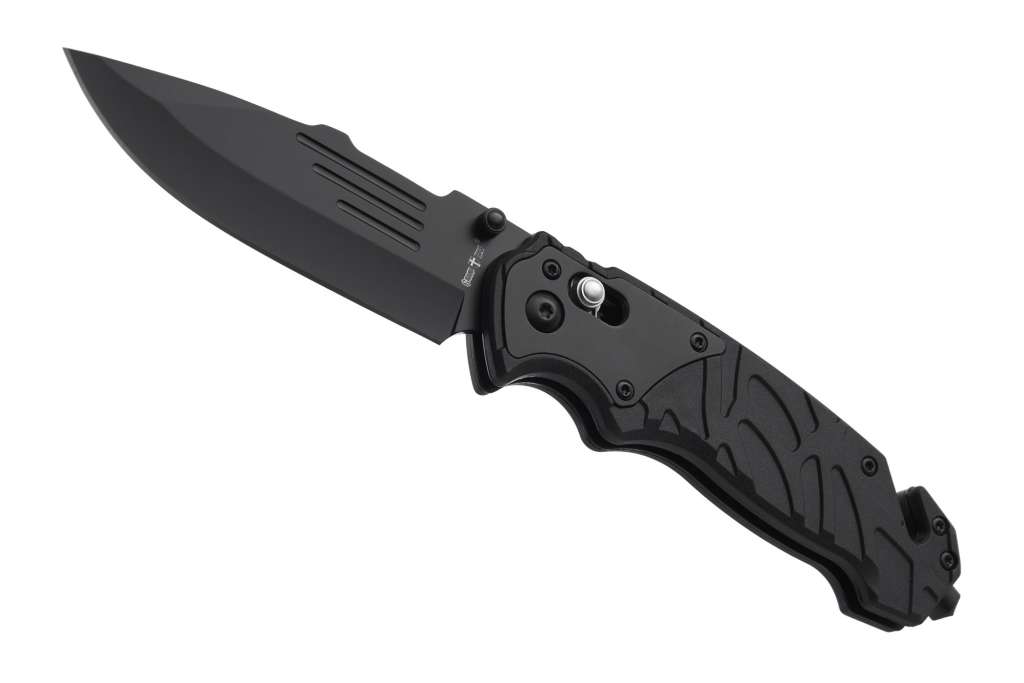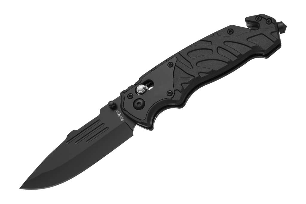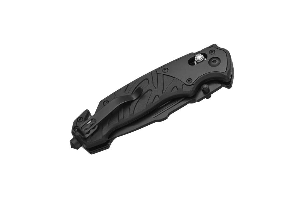 Поблизу навершя в руків’ї розташований стропоріз. Цей пристрій допоможе легко розрізати мотузку, дріт, пакувальний шнур або ремінь (у тому числі ремінь безпеки в автомобілі).