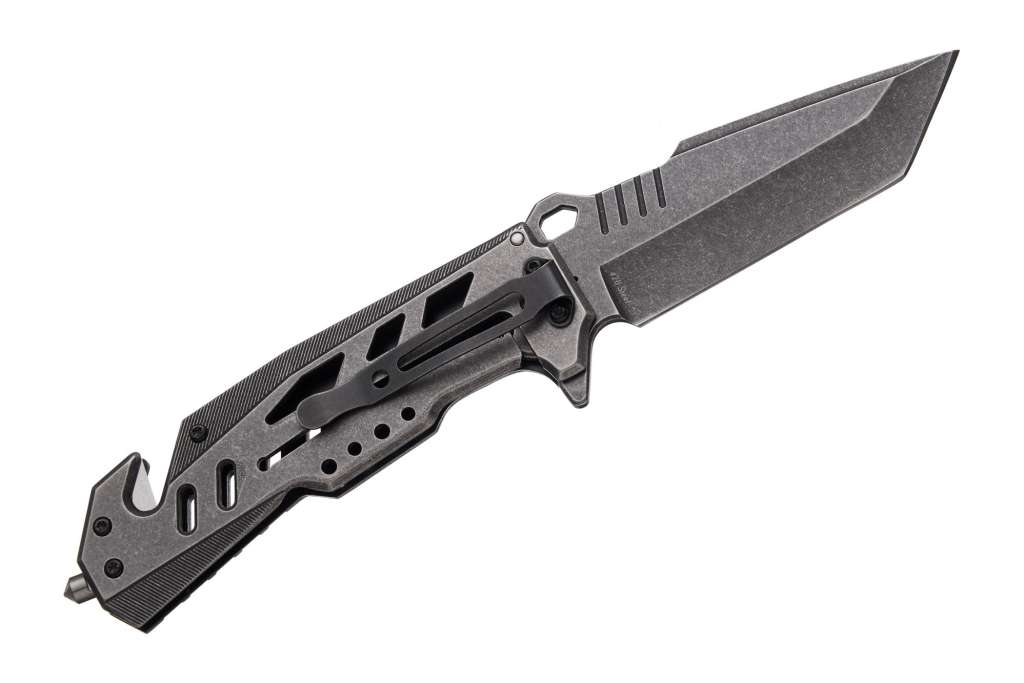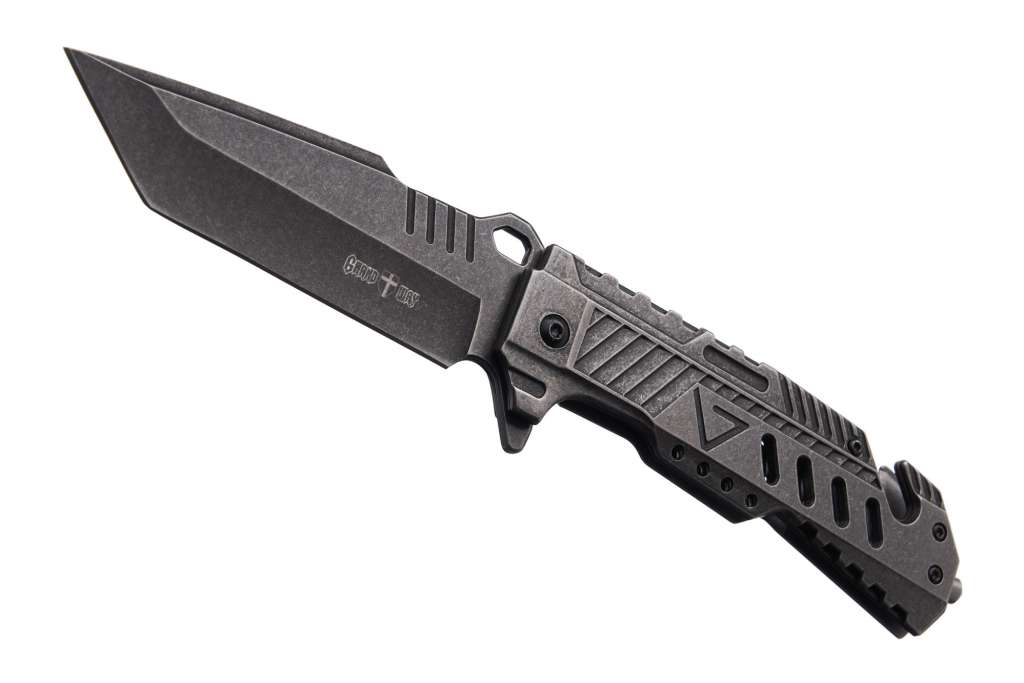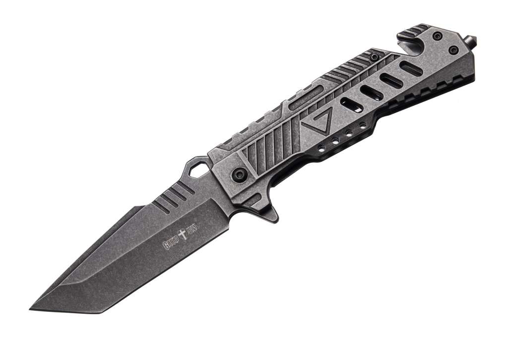 Але Grand Way 220186-4 привертає увагу не тільки дизайном. Насправді цей ніж може стати не тільки корисним ріжучим інструментом а й справжнім засобом порятунку. Бо крім міцного та ефективного клинка типу американський танто у його руків’ї розташовані склобій та стропоріз.