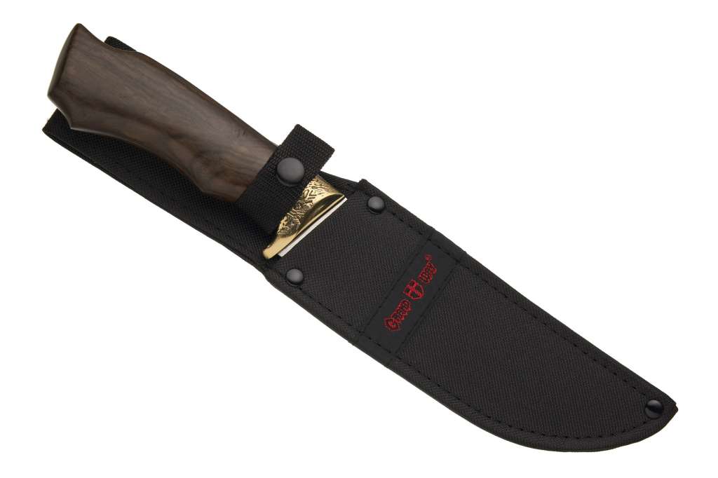 Руків’я ножа виконане з металу та полірованого стабілізованого дерева та має ергономічну форму (воно навіть дещо нагадує “козячу ніжку”, що часто використовувалась для виготовлення руків’я мисливського ножа у минулі часи). Больстер дуже вдало оздоблений дещо абстрактним рослинним орнаментом.