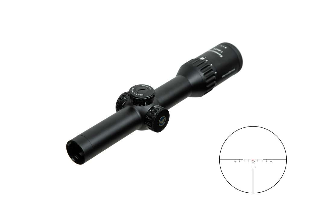 Оптичний приціл Continental X6 1-6x24 SFP Tactical має німецьку оптичну систему з використанням лінз LaREE та VePRO FMC, які забезпечують більше 90% пропускання світла. Має дуже мале спотворення, надзвичайно низька дисперсія скла, чудово підходить як для світанку так і сутінків. Приціл виготовлений з високоякісного авіаційного алюмінію 6061 T6, система регулювання виготовлена з авіаційного алюмінію 7075 T6. Приціл характеризується широким полем огляду - 23° при кратності 1х, постійним видаленням вихідної зіниці 100 мм, тому Вам не доведеться змінювати положенння голови відносно окуляра при зміні кратності, відсутністю внутрішніх темних кілець навколо зображення. Поправки мають можливість скидання та блокування барабанів. Прицільна сітка VET-BTR BDC має 6 налаштувань підсвічування центральної точки та кільця навколо точки. Сітка допомагає швидко охоплювати та утримувати ціль. Приціл пройшов випробування віддачі на калібрі .338 Lapua Magnum та має широкий спектр застосування: спорт, тактика і полювання.