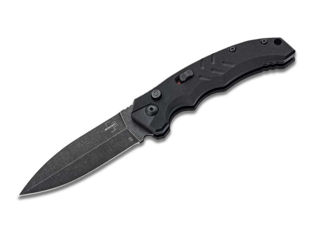 Розроблений як тактичний автоматичний ніж, Böker Plus Intention не тільки переконливий у польових умовах, але й без особливих зусиль справляється з усіма завданнями, що виникають у повсякденному житті. Натискання на кнопку звільняє лезо з практичною обробкою стоунвош, виготовлене з D2, і під дією натягу пружини за ним воно автоматично складається. Додатковий блокатор захищає ніж від випадкового розкриття. Рукоятка ергономічної форми виконана з текстурованого G10, ребристість в області упору для великого пальця і виражена виїмка покращують положення руки при роботі. З петлею для темляка та кліпсою (вістрям вниз).