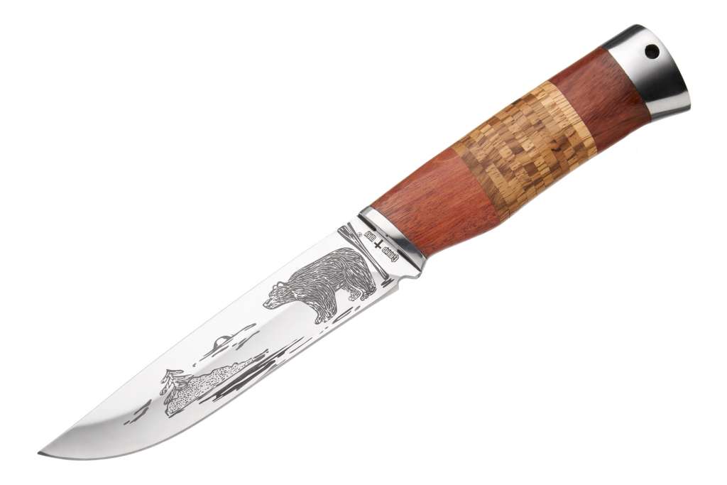 Руків'я ножа має овальний переріз та помітне “черевце” у ниджній частині, що забезпечує стабільне та надійне утримання. Деревина, використана для руків'я,гарно оброблене та приємне на дотик навіть в умовах екстремальних температур. Саме руків'я зі смаком набране з різних порід цінної деревини. Вигідне гармонійне поєднання різних кольорів та фактур дерева служить справжньою прикрасою руків'я та ножа загалом.