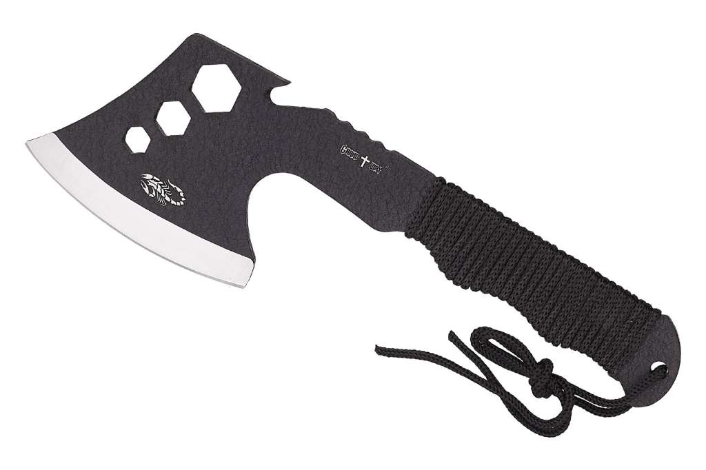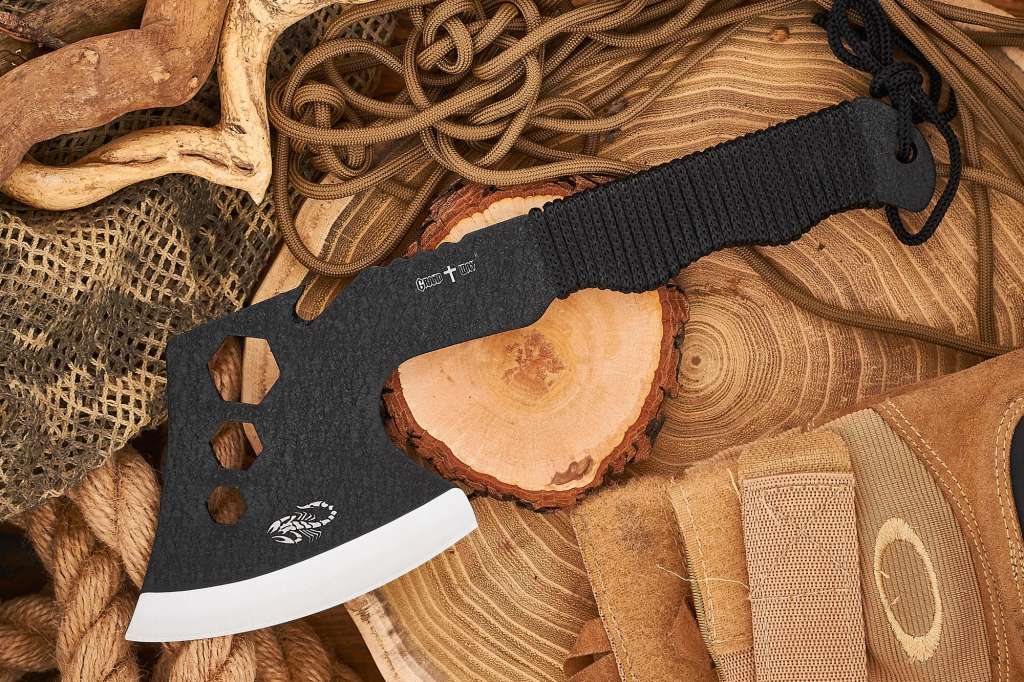 Сам топорик - цельнометаллический, выштампованный из листа нержавеющей стали марки 420. Эта нержавеющая сталь хорошо известна своей исключительной устойчивостью к коррозии, простотой заточки и пластичностью. А значит, она не будет образовывать сколы, что для рубящего инструмента особенно полезно.
