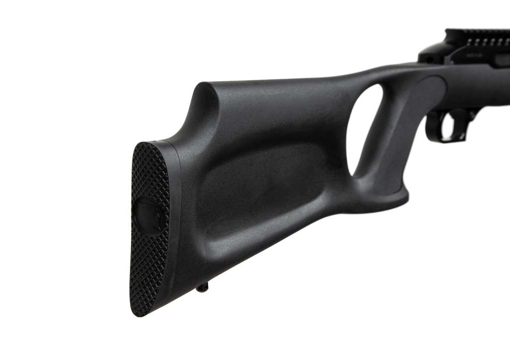 Форма щоки приклада дозволяє вкладуватись в зброю як з лівого так і з правого плеча.