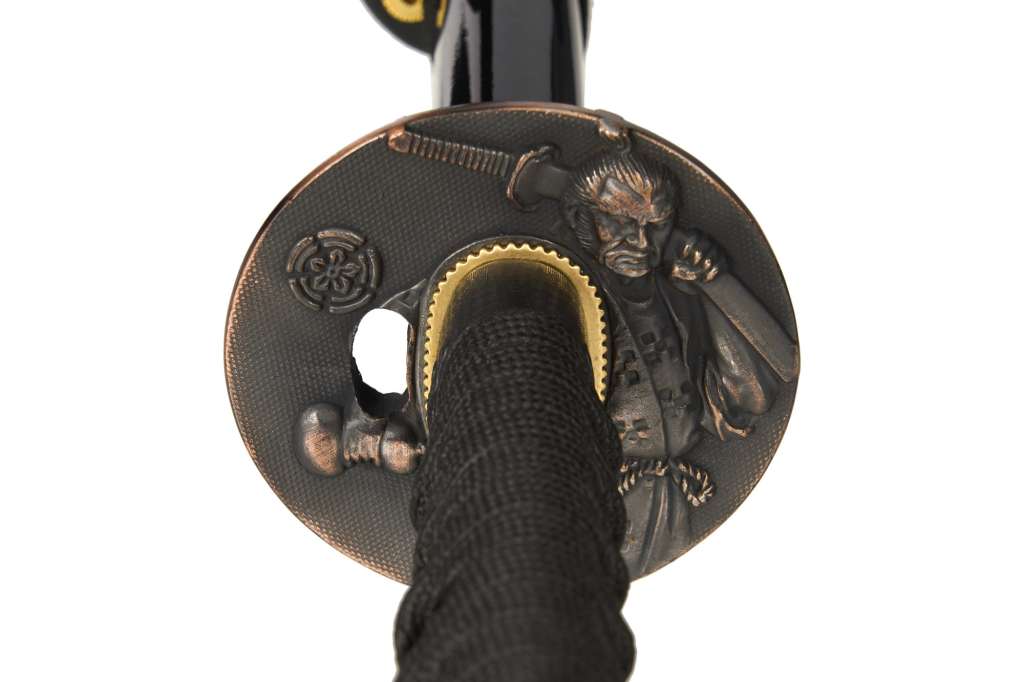 Цуба (гарда меча) відноситься до типу “мару-гата” (круглі цуби). На литих зображеннях, що прикрашають цубу, можна добре розрізнити сакура-мон – герб, що зображує квітку вишні (символ вірності традиціям). Також на цубі ми бачимо зображення фігури воїна-мандрівника. На його одязі добре помітний ишидатами – мон (символ твердості волі, знак священиків). У руці воїна ми бачимо гарбуз-горлянку, що є символом простоти та життєвої сили, з яким часто традиційно зображують ченців та святих.