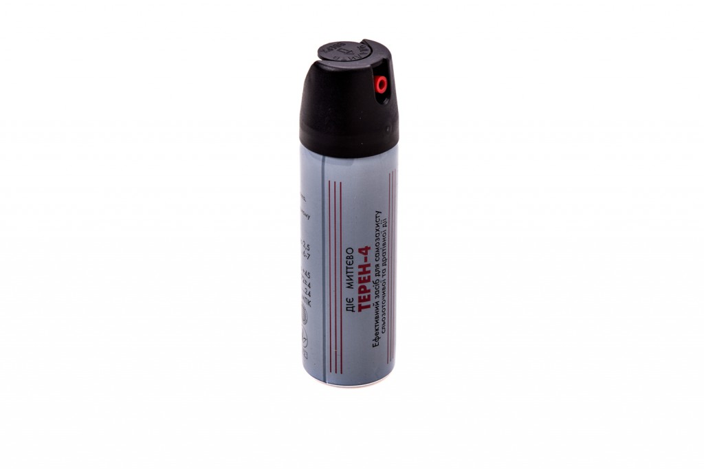 ОПИСАНИЕ: Изделия "Терен-4" (ТУ У 29.6-19485052-019-2002) предназначены для использования гражданскими лицами в качестве средства самозащиты и представляют собой баллоны аэрозольного типа, заполненные препаратом, содержащим вещество слезоточивого и раздражающего действия (ирритант) - морфолид пеларгоновой кислоты. Препарат оказывает воздействие "конусом" аэрозольного облака, он эффективен при применении как против лиц, находящихся в состоянии алкогольного опьянения, так и против собак. Изделия являются однофункциональными, невосстанавливаемыми и неремонтируемыми. Применяемый состав не разрушает озоновый слой.