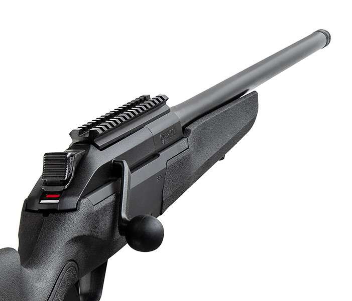 Винтовка, была презентована мировой общественности в октябре этого года. Она оснащена линейной системой перезарядки. Это означает, что не требуется вращения или перемещения рукоятки затвора, как в привычной всем конструкции “болтовика”. Перезарядка “прямохода” осуществляется существенно быстрее благодаря плавному ходу затвора. Движение затвора настолько мягкое, что перезарядку можно осуществлять всего одним пальцем. На задней части затвора располагается трехпозиционный предохранитель. Безгранично будут счастливы левши - всего за полминуты можно изменить не только сторону размещения рукоятки затвора, но и направление экстракции гильзы. УСМ новинки съемный, регулируемый и позволяет установить усилие спуска на 0,9 кг; 1,2 кг; или 1,5 кг. Ну и главная особенность изделия - это мультикалиберность, с возможностью замены ствола под другие калибры своими силами. На данный момент доступны следующие калибры: 308 Winchester, .30-06 Springfield и .300 Winchester Magnum.