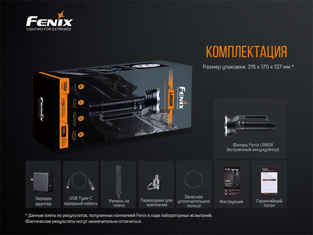 Ліхтар моделі Fenix LR80R являє собою дуже яскравий, компактний прилад для здійснення пошукових операцій. Його найбільший світловий потік досягає 18 тисяч люменів, при цьому далекобійність променя – понад кілометр. Прекрасні можливості для практичних завдань. Функціонує такий потужний ліхтар на батарейці 7,2 V/12000mah Li-ion, яка вбудована прямо в корпусі моделі. Акумулятор відрізняється досить великою продуктивністю, і без зарядки ліхтар здатний світити протягом 25 днів. Це допомагає виконати завдання, що вимагають великої ефективності.