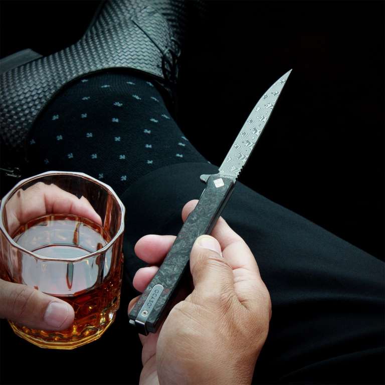 Fat Carbon® - це міцний і легкий композит із вуглецевого волокна, який, здається, змінюється та "грає" під впливом світла, що ідеально поєднується з ефектним клинком з дамаської сталі.