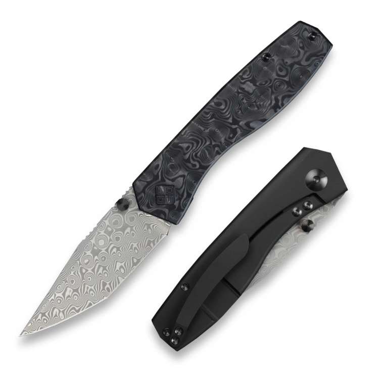 Fat Carbon® - це міцний і легкий композит із вуглецевого волокна, який, здається, змінюється та "грає" під впливом світла, що ідеально поєднується з ефектним клинком з дамаської сталі. Delos оснащений підшипниками із сепаратором із нержавіючої сталі для швидкого та плавного відкриття та надійно утримується в кишені за допомогою контурного титанового кишенькового затиску.