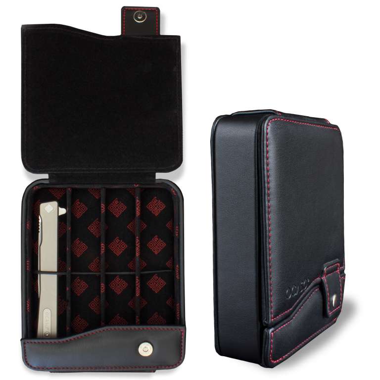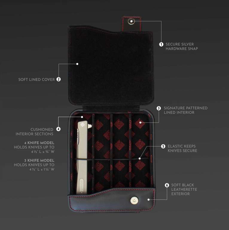 Елегантний футляр, призначений для носіння, захисту та демонстрації вашої колекції ножів. Зовні з м'якої чорної штучної шкіри з червоним рядком, срібною фурнітурою та внутрішньою частиною з м'якою підкладкою та контрастним червоним принтом з фірмовим значком Ocaso. Чохол легко відстібається, відкриваючи колекцію ножів, які зберігаються в окремих м'яких секціях та закріплюються гумкою для збереження.
