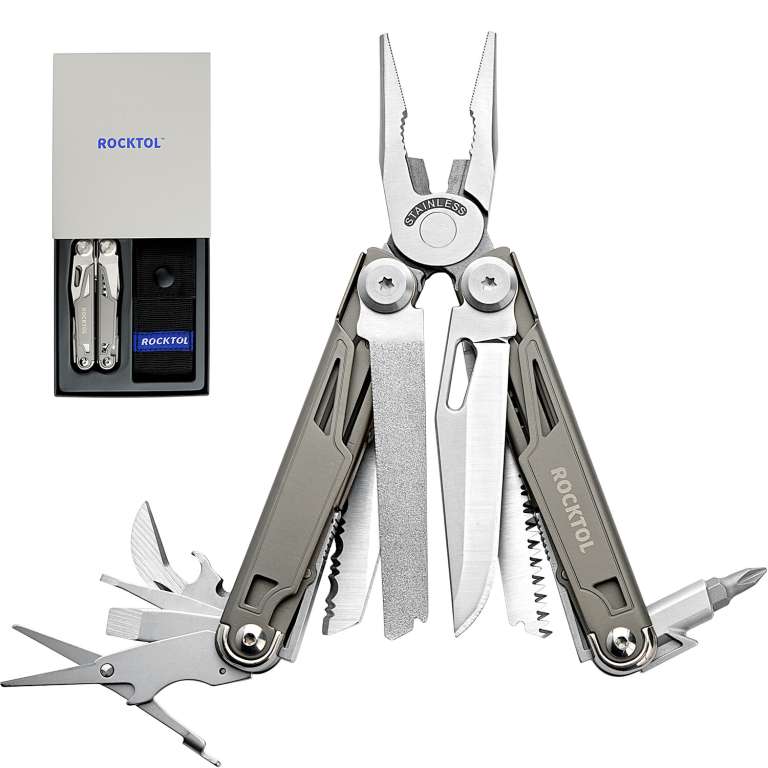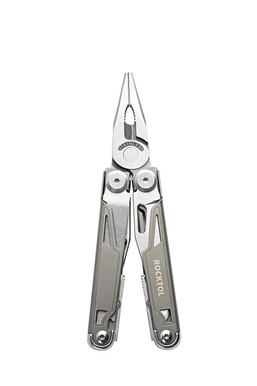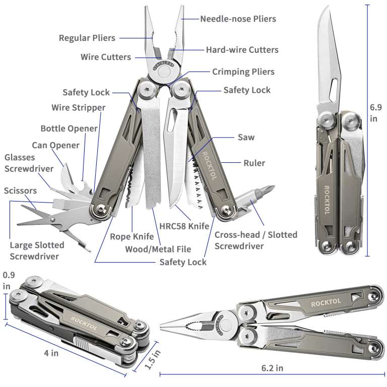 Представляємо високоякісний багатофункціональний інструмент Rocktol 19 в 1 з рамою з титановим покриттям та надгострим ножем із нержавіючої сталі марки 7Cr17 з твердістю до HRC 58. Він ідеально підходить для складних робіт та пригод на природі. Кожен інструмент оснащений надійним механізмом блокування для додаткової безпеки, а міцна конструкція з нержавіючої сталі гарантує його довговічність. Крім того, компактна та легка конструкція, а також міцний нейлоновий чохол дозволяють легко носити його із собою, куди б ви не подалися.