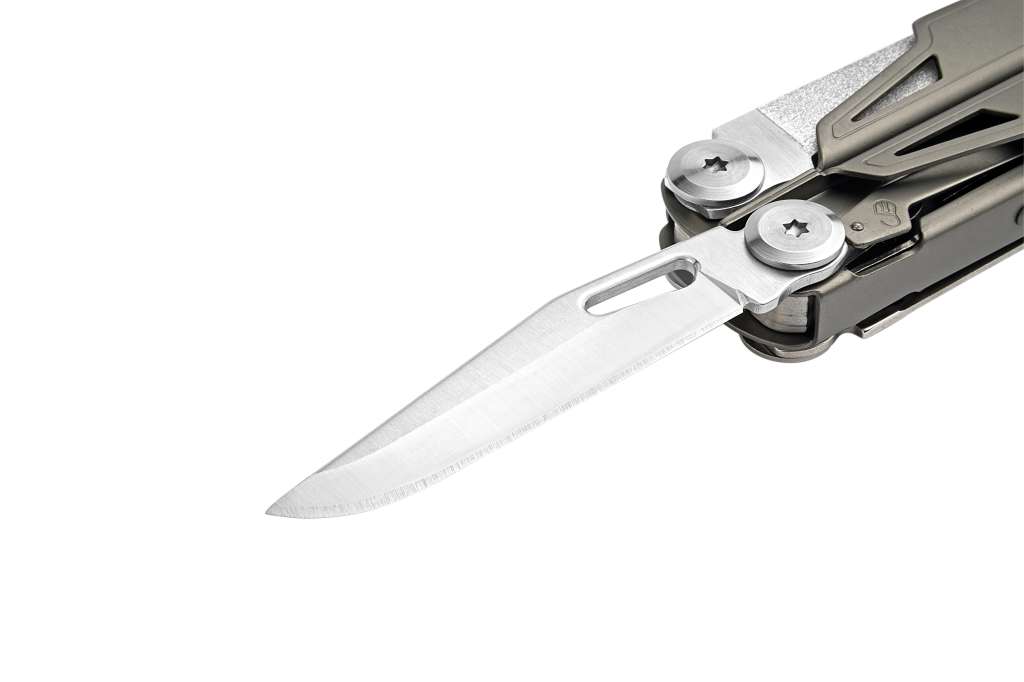 Багатофункціональні плоскогубці: цей багатофункціональний інструмент EDC оснащений інструментами з титановим покриттям рукоятки, які доступні у складеному положенні, включаючи серрейторний ніж для волокнистих об'єктів, кишеньковий ніж, пилку, напилки по дереву та металу та інші функції, такі як інструмент для зачистки дротів, особливо тверді і звичайні кусачки для дроту, плоскогубці, гострогубці, консервні та пляшкові відкривалки, лінійки для розмітки, пружинні ножиці, шліцева викрутка та хрестова викрутка, велика шліцева викрутка, викрутка для окулярів.
