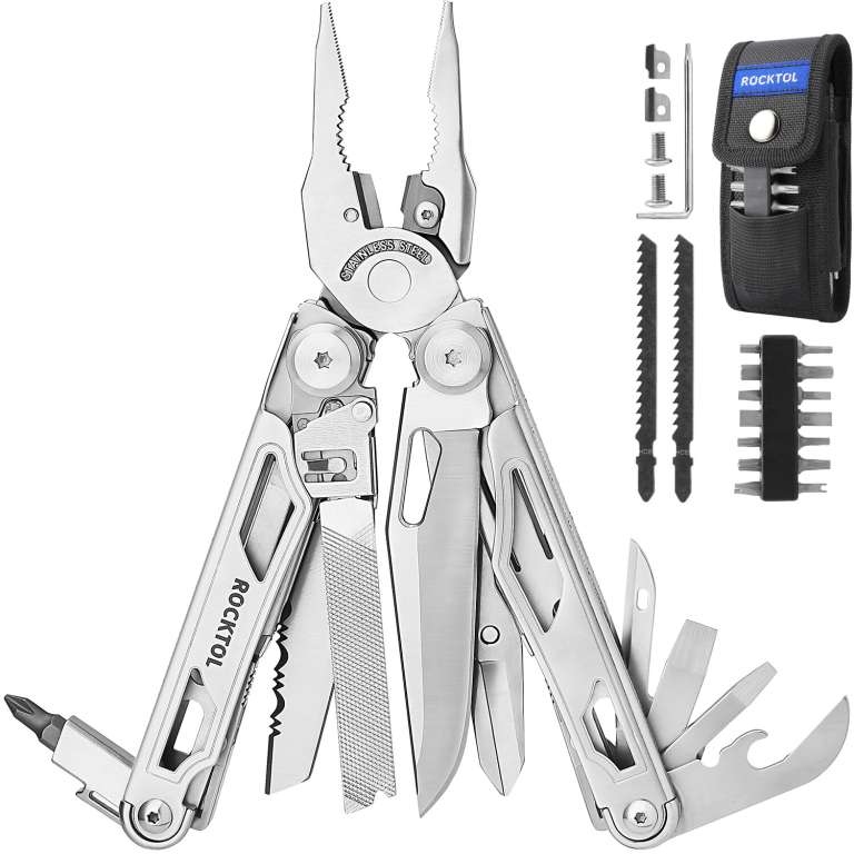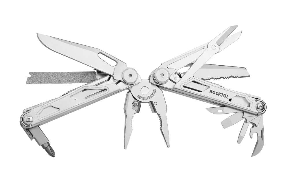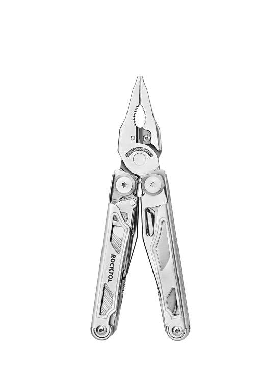 Міцний багатофункціональний інструмент 29 в 1: цей потужний багатофункціональний інструмент поєднує 29 інструментів, основні з яких доступні у складеному положенні, такі як кишеньковий ніж, зубчастий ніж, змінна пила по дереву та напильник по дереву/металу, а також великі пружні ножиці. Інші функції включають звичайні плоскогубці, гострогубці, змінні кусачки для дроту, інструменти для зачистки дротів, шило, відкривалки для пляшок і консервних банок, шліцеві та плоскі викрутки, біт-викрутка з 8 двосторонніми бітами (SP8+SP4, TT25+TT TT10, SL6+SL5, SL4+SL3, H5+H4, H3+H2.5, PH2+PH1). Всі інструменти мають запобіжні замки для впевненого використання.