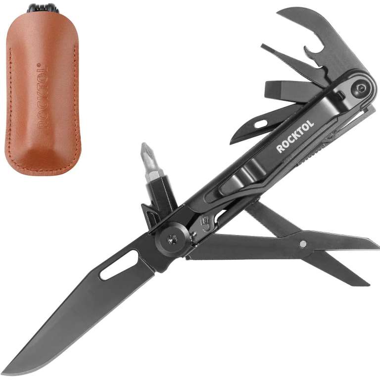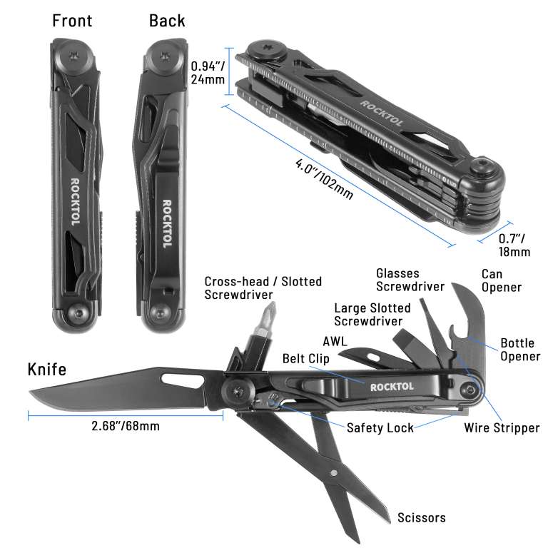 Багатофункціональний ніж Rocktol оснащений лезом довжиною 68 мм, виготовленим із високоякісної нержавіючої сталі марки 7Cr17 з твердістю HRC58, що забезпечує тривалу гостроту та легке різання. Він може похвалитися додатковими функціями, включаючи викрутки Phillips #1 та 3/16", шліцеві та плоскі викрутки, відкривалки для банок та пляшок, інструмент для зачистки проводів, шило, великі ножиці та вбудований кишеньковий затискач.