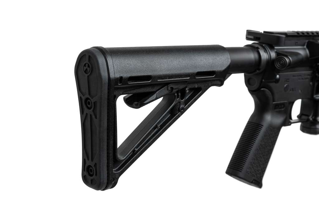 На карабіні встановлений міцний і легкий регульований 6-позиційний приклад Magpul MOE з гумовим потиличником.