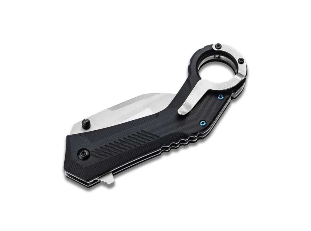Швидко, скоріше, Veloc! Boker надає Magnum Veloc імпульсу та забезпечує ніж типу Karambit пружинним механізмом відкривання. Фліппер або додатковий штифт для великого пальця відкривають агресивне лезо зі сталі 440B типу Wharncliffe з необхідним попутним вітром, тоді як лінійний замок надійно фіксує допоміжний відкривач на місці. Вигнута рукоятка з текстурованими накладками G10 забезпечує відмінне захоплення і закінчується характерним кільцем на кінці рукоятки, яке спочатку призначалося для кріплення ножа до мізинця, але також використовується як отвор для темляка. Сині анодовані елементи, такі як кільце вздовж поворотного гвинта та гвинти рукоятки, додають сучасні акценти класичній формі ножа Південно-Східної Азії. Із затискачем tip-up(r).