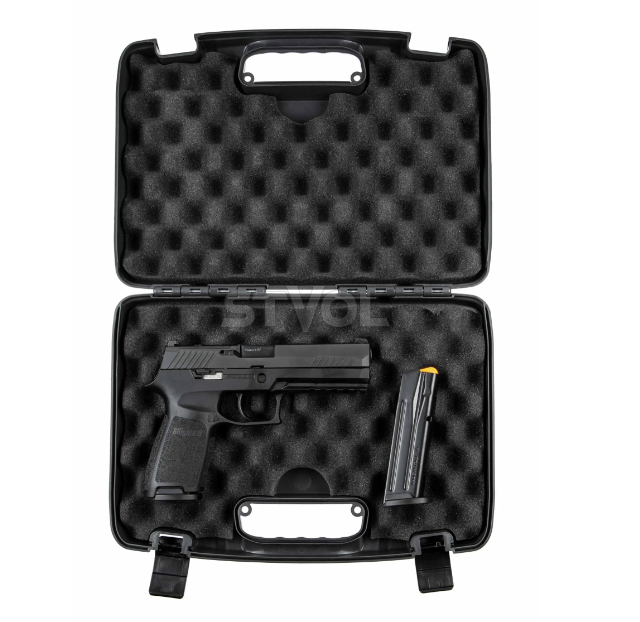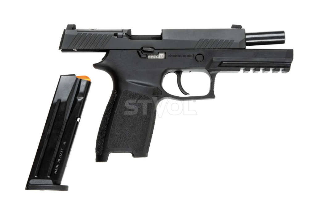 -затворна рама виконана з нержавіючої сталі та оснащена протиковзкими насічками. Затвор оброблений покриттям Nitron – металеве захисне покриття, яке наноситься на деякі моделі вогнепальної зброї SIG SAUER. Це надзвичайно твердий, мікроскопічно тонкий бар'єр, який захищає металеві покриття від корозії та косметичних ушкоджень.