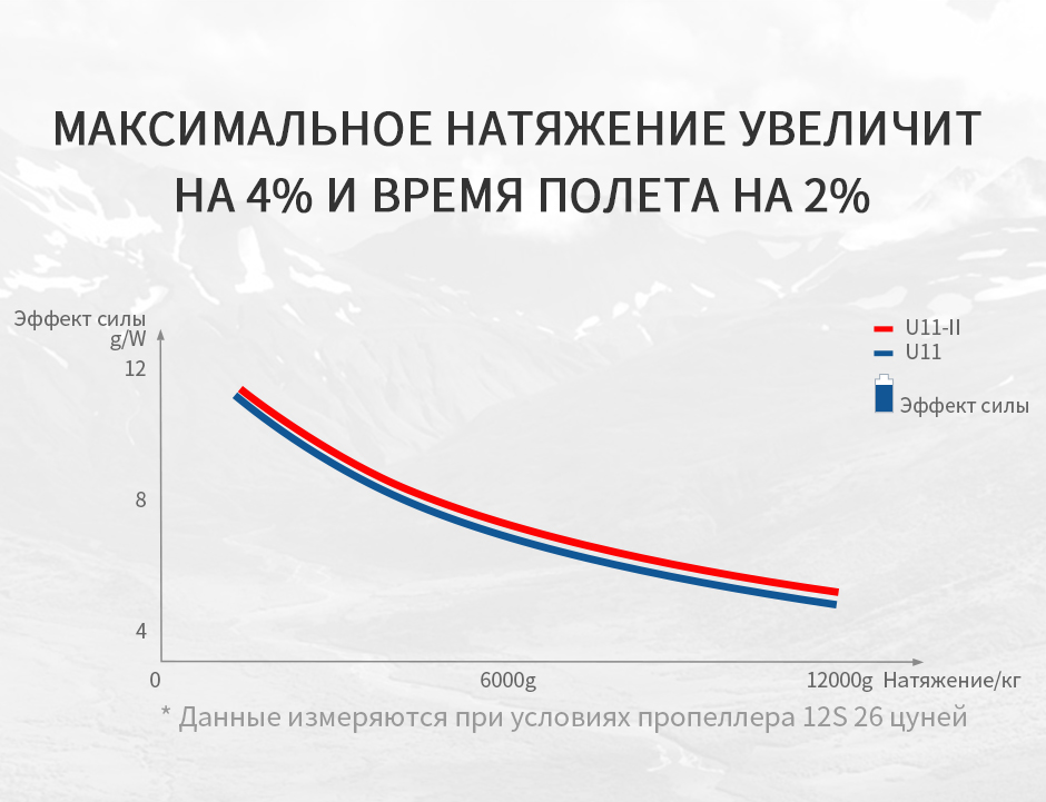 | U11-Ⅱ KV120 | 48 | T-MOTOR 28*9.2” CF | 40% | 2950 | 0.93 | 5.19 | 1934 | 252 | 11.72 | 118 (температура окружающей среды: 19℃) |