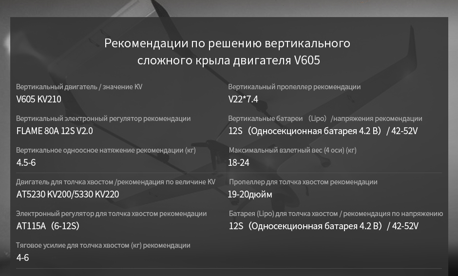 | Значение KV | KV210 | Батарея (Lipo)/напряжение | 12S(Односекционная батарея 4.2 В)/42- 52V) |