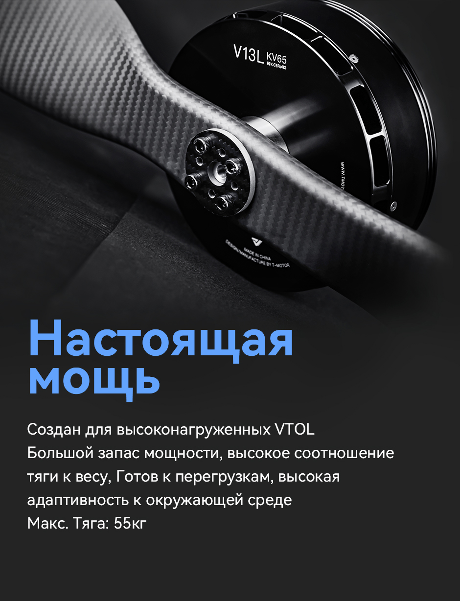 V13L KV65 24S – ультрамощный бесколлекторный мотор T-Motor для крупных VTOL-дронов и сверхтяжёлых UAV. Работает на 24S LiPo, низкий KV65 обеспечиваeт огромную тягу, эффективную работу с очень большими винтами и максимальную стабильность полёта.