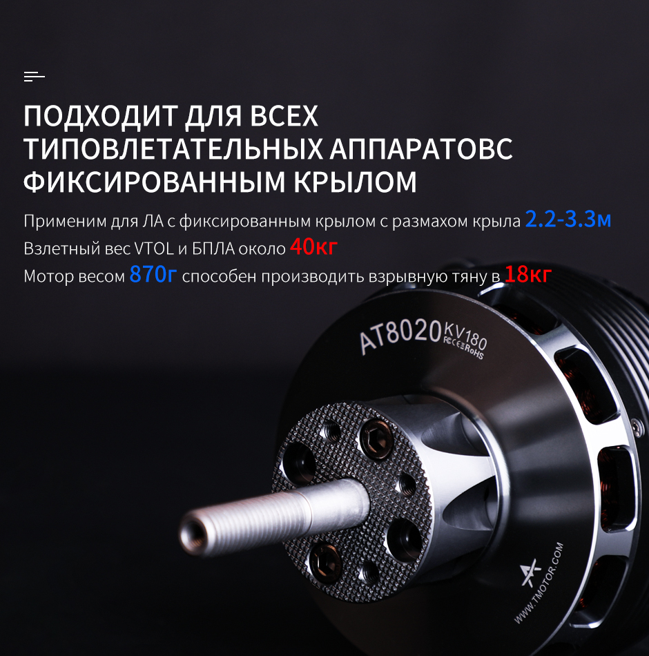 AT8020 – мощный бесколлекторный мотор для фиксированного крыла, аналог 55cc ДВС, рассчитан на питание от 10–14S LiPo. Подходит для средних и крупных авиамоделей, обеспечивает высокую тягу и стабильную работу. Доступен в двух вариантах KV180 и KV210