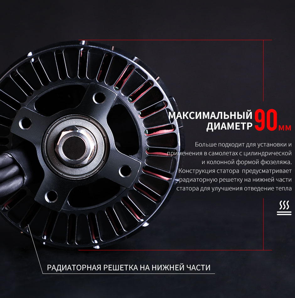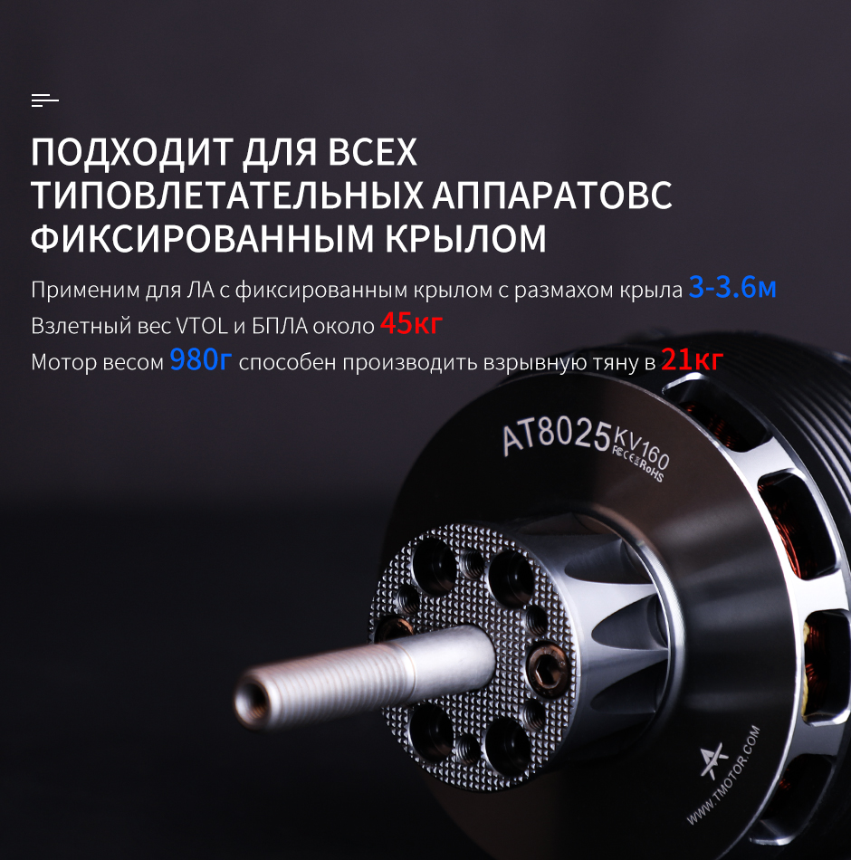 AT8025 – высокомощный бесколлекторный мотор T-Motor для самолётов с фиксированным крылом, по классу аналог 70cc ДВС, рассчитан на 10–14S LiPo. Подходит для крупных авиамоделей, даёт высокую тягу и надёжную работу. Выпускается в вариантах KV160 и KV190.
