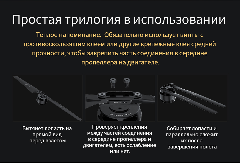 (2 )Пpоверьте повреждение пропеллера из полимера или нет перед взлетом аппаратасли имеется поврежде ние, замените его вовремя,в противном слуЧае имеет скрыту опасность поломки.