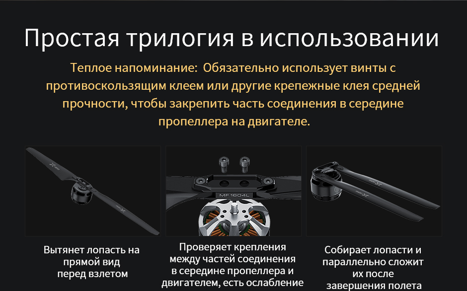 (1) Пepeд использованием внимательно проверьте установку винта на месте перекрытия или нет. Пропеллеp из полимера должен быть установлен нa мecтe.