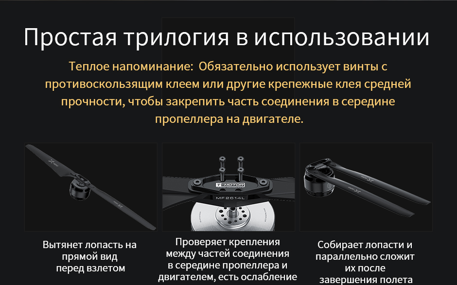 (3 )Eсли пропеллер из полимера упадет или подвергнется эквивалентному удару при использовании, приведет к деформации или трешинам и т. д. лопасти, своевременно замените нову лопасть.