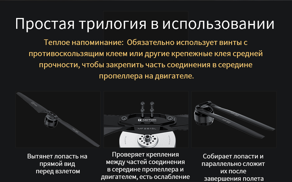 (3 )Eсли пропеллер из полимера упадет или подвергнется эквивалентному удару при использовании, приведет к деформации или трешинам и т. д. лопасти, своевременно замените нову лопасть.