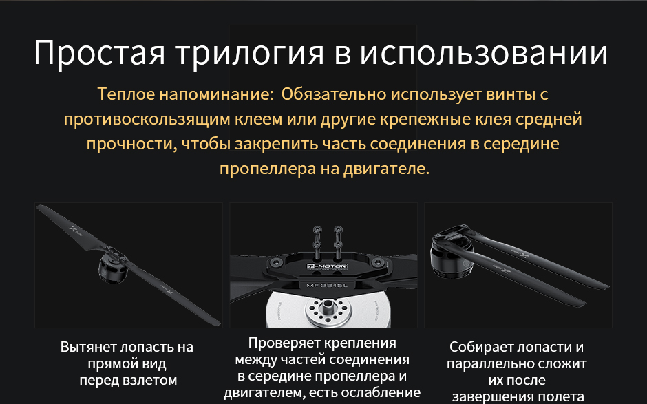 (3 )Eсли пропеллер из полимера упадет или подвергнется эквивалентному удару при использовании, приведет к деформации или трешинам и т. д. лопасти, своевременно замените нову лопасть.