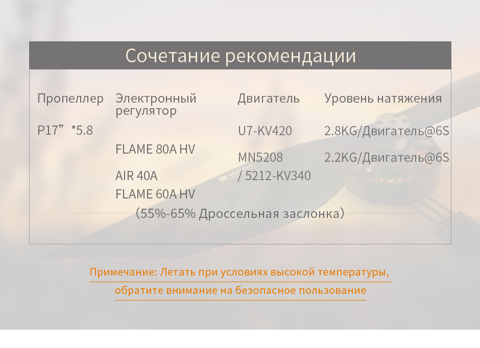 (3)Прочность конструкции пропеллера была полностьо проверена. Используйте его разумно в пределах диапазона максимального натяжения рекомендации. Eсли превышает предел натяжения, то повредит лопасть; не проверяйте прочность лопасти методом изгиба от руки и т. д. Данный метод значительно отличается от фактической силы поддержки полета, также может привести к повреждению лопасти.