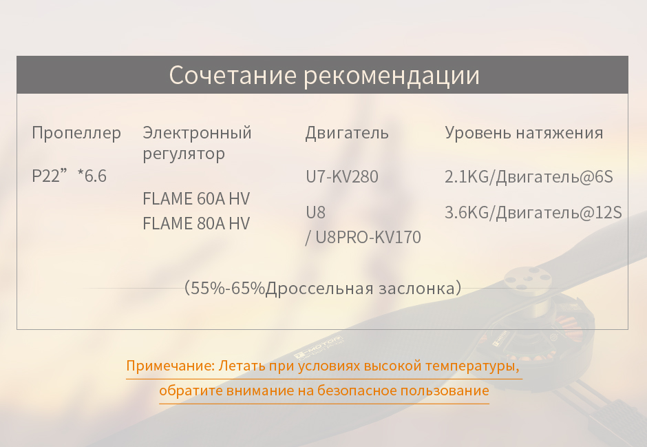(3)Прочность конструкции пропеллера была полностьо проверена. Используйте его разумно в пределах диапазона максимального натяжения рекомендации. Eсли превышает предел натяжения, то повредит лопасть; не проверяйте прочность лопасти методом изгиба от руки и т. д. Данный метод значительно отличается от фактической силы поддержки полета, также может привести к повреждению лопасти.