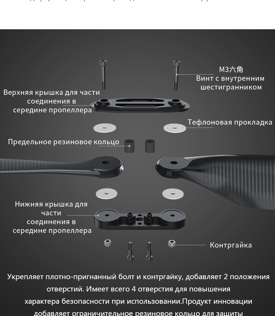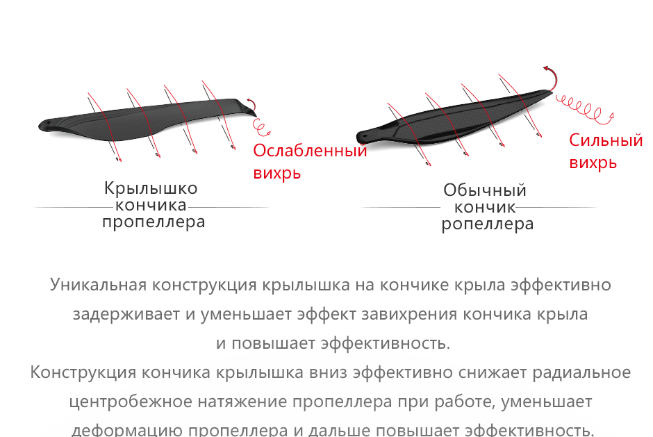 (3)Прочность конструкции пропеллера была полностьо проверена. Используйте его разумно в пределах диапазона максимального натяжения рекомендации. Eсли превышает предел натяжения, то повредит лопасть; не проверяйте прочность лопасти методом изгиба от руки и т. д. Данный метод значительно отличается от фактической силы поддержки полета, также может привести к повреждению лопасти.