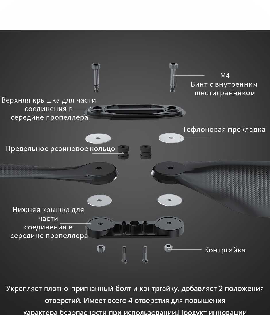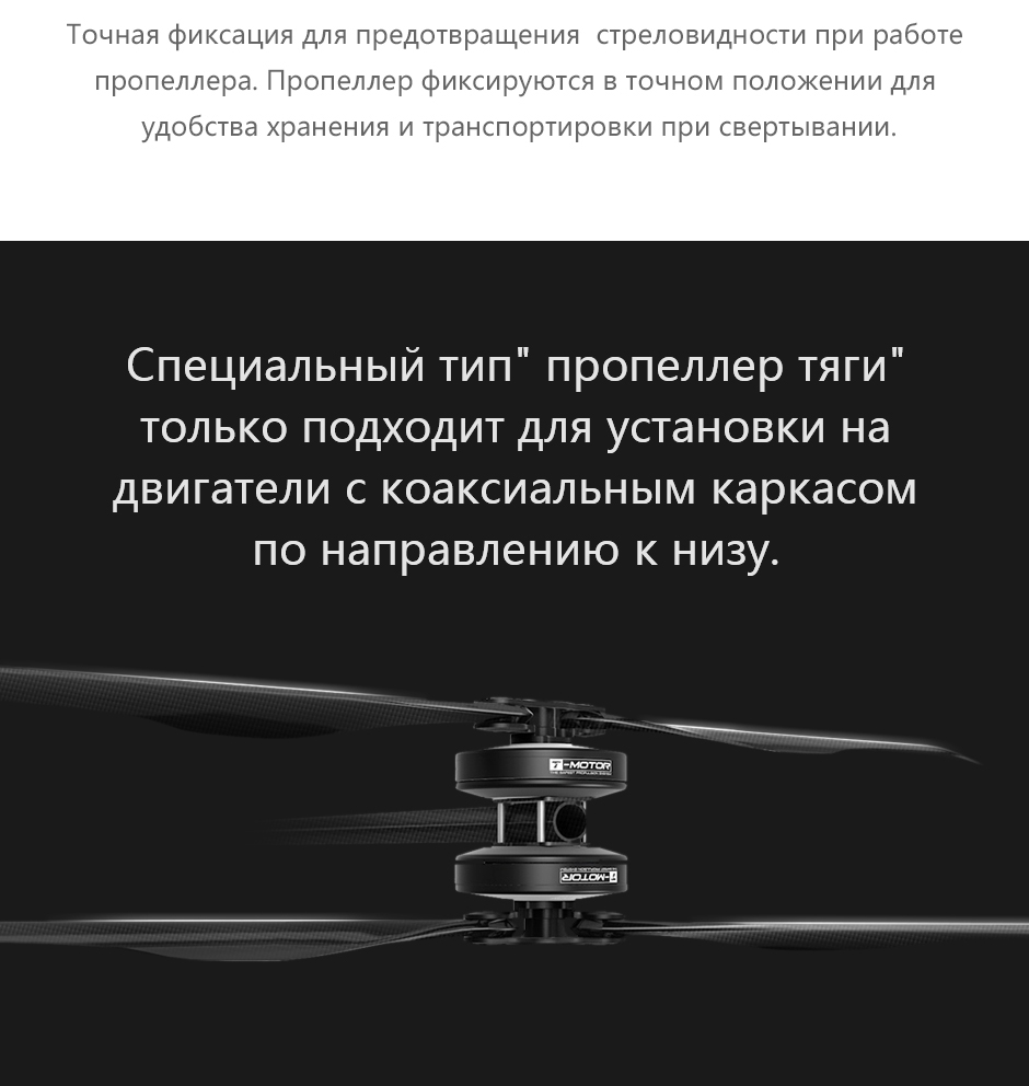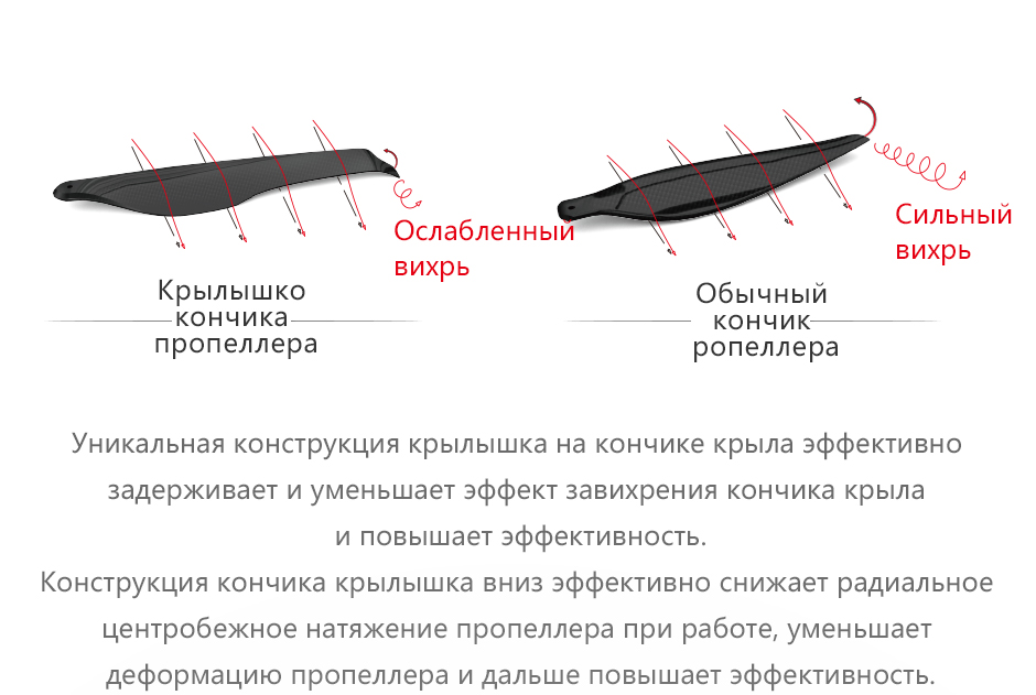 (3)Прочность конструкции пропеллера была полностьо проверена. Используйте его разумно в пределах диапазона максимального натяжения рекомендации. Eсли превышает предел натяжения, то повредит лопасть; не проверяйте прочность лопасти методом изгиба от руки и т. д. Данный метод значительно отличается от фактической силы поддержки полета, также может привести к повреждению лопасти.