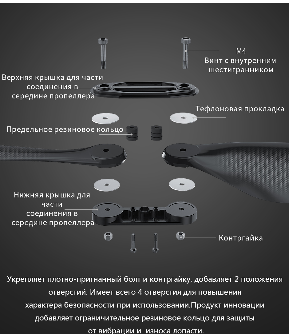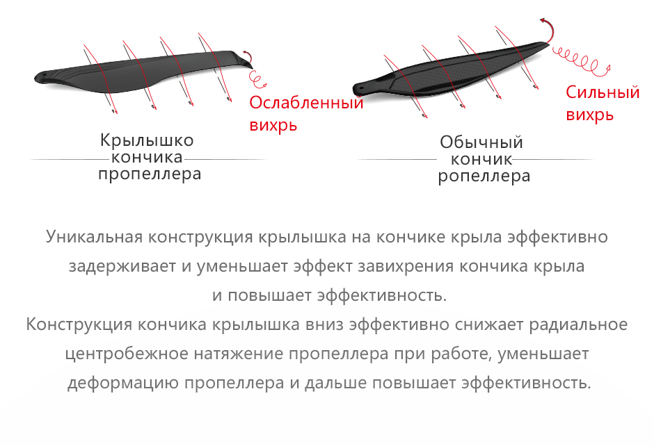 (3)Прочность конструкции пропеллера была полностьо проверена. Используйте его разумно в пределах диапазона максимального натяжения рекомендации. Eсли превышает предел натяжения, то повредит лопасть; не проверяйте прочность лопасти методом изгиба от руки и т. д. Данный метод значительно отличается от фактической силы поддержки полета, также может привести к повреждению лопасти.
