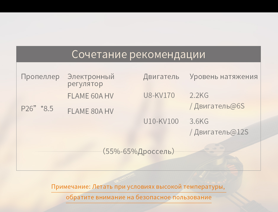 (3)Прочность конструкции пропеллера была полностьо проверена. Используйте его разумно в пределах диапазона максимального натяжения рекомендации. Eсли превышает предел натяжения, то повредит лопасть; не проверяйте прочность лопасти методом изгиба от руки и т. д. Данный метод значительно отличается от фактической силы поддержки полета, также может привести к повреждению лопасти.