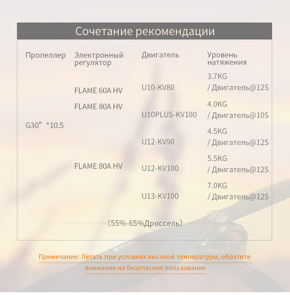 (3)Прочность конструкции пропеллера была полностьо проверена. Используйте его разумно в пределах диапазона максимального натяжения рекомендации. Eсли превышает предел натяжения, то повредит лопасть; не проверяйте прочность лопасти методом изгиба от руки и т. д. Данный метод значительно отличается от фактической силы поддержки полета, также может привести к повреждению лопасти.