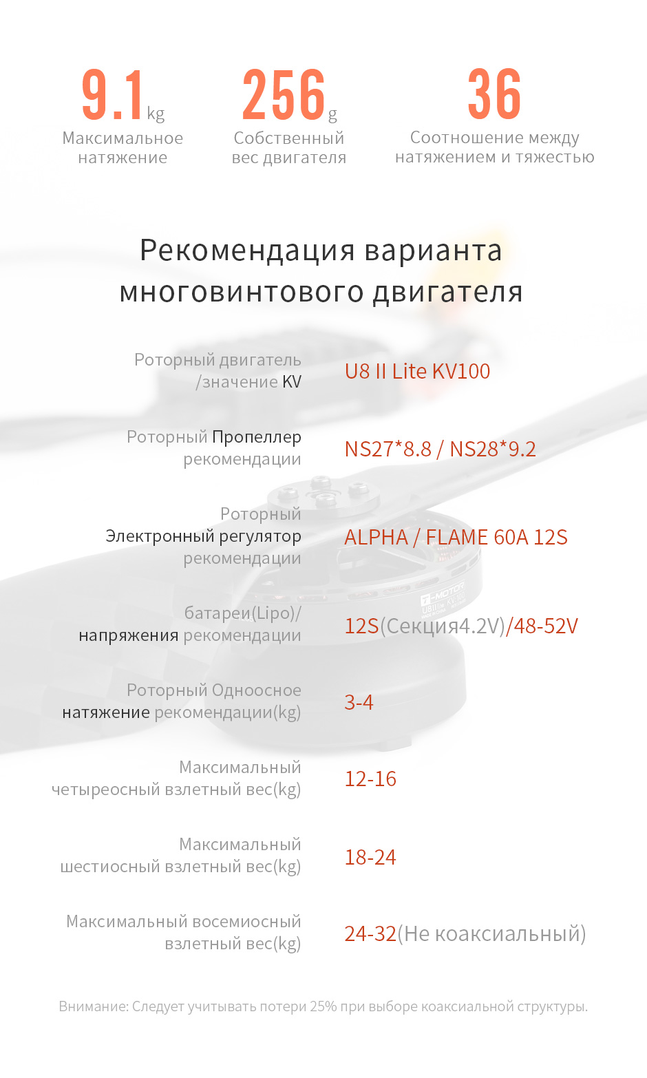| Значение KV | 100 | Номинальное рабочее напряжение (Lipo) | 12S(4.2V Секция) / 48-52V |