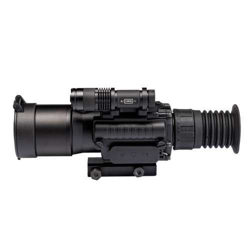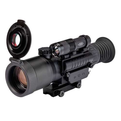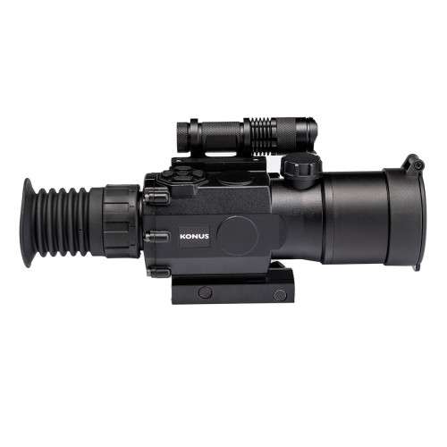 KONUS KONUSPRO NV-2 3-9x50 — універсальний цифровий приціл нічного бачення з робочою дистанцією спостереження 150 метрів. Робота прицілу ґрунтується на CMOS-сенсорі, інформація з якого виводиться на вбудований TFT-екран в окулярі. Вести спостереження та прицільний вогонь можна як у денний, так і в нічний час. Користувачеві доступні по 3 різні режими для кожного часу доби. Для повної темряви передбачено ІЧ-освітлювач на корпусі. Програмне масштабування працює в діапазоні 3x - 9x. Приціл нічного бачення KONUS KONUSPRO NV-2 3-9x50 має цифрову прицільну сітку типу 30/30 (перехрестя з двох ліній однакової товщини). Введення поправок виконується у цифровому вигляді за допомогою клавіш на корпусі (крок 1/10 MIL). Запис відео ведеться на карту пам яті microSD, яка вже входить у комплект. Для підключення пристрою до зовнішнього екрана використовується аналоговий інтерфейс AV. Через USB-кабель можна передавати файли з карти пам яті на ПК, не використовуючи SD-адаптер. ПНБ-приціл встановлюється на планку Вівер/Пікатінні, а для затягу може знадобитися ріжковий або торцевий ключ на 13. Конструктивні особливості: Знімне кріплення на планку Вівер/Пікатінні 3 режими денного спостереження: кольоровий/чорно-білий/зелений 3 режими нічного бачення: нейтральний/чорно-білий/зелений Вбудований ІЧ-освітлювач для повної темряви Функція запису фото/відео Карта пам яті на 8 Гб у комплекті Універсальний зарядний пристрій Перезаряджувані акумулятори в комплекті Контрастний фільтр для денного спостереження у комплекті Регулювання діоптрій на окулярі Комплектація: Приціл денного та нічного бачення М який чохол через плече База для кріплення на планку Вівер/Пікатінні Акумулятори: 18650 / 14500 AV-кабель USB-кабель USB-адаптер живлення (5 V/2 A) Серветка для очищення оптики