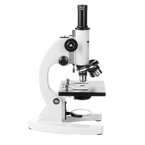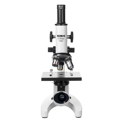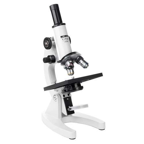 Біологічний мікроскоп KONUS College 60х-600х призначений для оснащення шкільних кабінетів біології, лабораторій університетів і професійних коледжів. Комплектація моделі включає в себе 15-кратний окуляр і 3 ахроматичні об єктиви кратністю 4, 10 і 40х (останній — з пружинною оправою для запобігання зіткнення зі зразком при фокусуванні). Таким чином, в базовій комплектації мікроскоп здатний працювати при збільшеннях 60, 150 або 600х. Основа, станина і всі механічні з єднання пристрою повністю виконані з металу. Однією з головних переваг KONUS College є регульований нахил станини: кут окулярного тубусу з вертикаллю може становити від 0 до 60°. Така конструктивна особливість гарантує вибір зручного положення для роботи стоячи або сидячи незалежно від віку і статури спостерігача. Великий прямокутний предметний столик фіксується нерухомо: наведення різкості здійснюється вертикальним переміщенням оптичного блоку. Рейковий механізм фокусування забезпечує точність налаштування. Окремі ручки грубого і тонкого фокусування розташовані по обидва боки корпусу. Для роботи мікроскопа KONUS College не потрібне джерело живлення: прилад здатний використовувати природне і штучне зовнішнє освітлення для підсвітки. Підсвічування зразка прохідним світлом реалізується за допомогою двостороннього плоско-увігнутого дзеркала, яке направляє світло на конденсор лінзи. Освітленість і контрастність зображення додатково коригується апертурною ірисовою діафрагмою з тримачем для світлофільтра. Завдяки якості виконання, простоті і надійності вузлів управління мікроскоп KONUS College часто купують на виріст . Ця модель, придбана в якості першого мікроскопа для молодшого школяра, відправиться разом з ним в випускний клас, а потім, можливо, допоможе при навчанні у вузі. Технічні характеристики: Класифікація: біологічний Призначення: навчальний Збільшення: 60x-600x Об єктиви: ахроматичні на 4x, 10x і 40x(s) Окуляр: WF15x Оптична довжина тубуса: 160 мм Тип мікроскопії: світлого поля Фокусування: грубе і точне, роздільне Тип фокусування: з допомогою рейкового механізму Предметний столик: з кліпсами, 12 х 11 см Підсвітка: плоско-увігнуте дзеркало Ø 4.6 см Лінза-конденсор з ірисовою апертурною діафрагмою Вбудований тримач світлофільтра Ø 3.2 см Конструктивні особливості: Насадка: монокулярна Посадковий діаметр окуляра: 23.2 мм Станина с регульованим нахилом (до 60°) Револьверна головка на 3 об єктиви, орієнтована назовні Гвинтовий стопор механізму фокусування Металевий корпус Прогумовані ніжки для запобігання ковзання Комплектація: Мікроскоп Об єктиви — 3 шт. Окуляр — 1 шт. Пилозахисний чохол Ключ для натягу механізму фокусування Габарити: Розміри упаковки: 36 x 25.5 x 20 см Вага упаковки: 2.3 кг Розміри мікроскопа: 32 х 17.5 х 12 см Вага мікроскопа: 1.6 кг