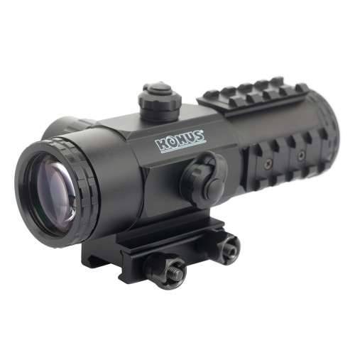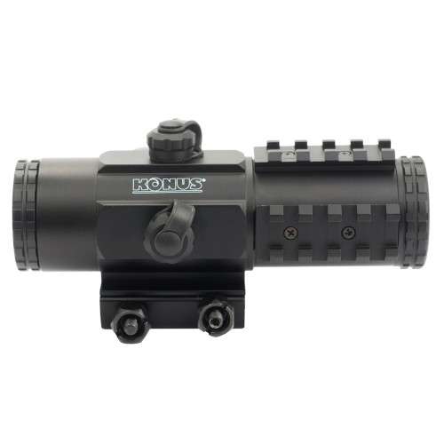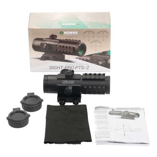 SIGHT-PRO PTS2 3x30 — унікальний призматичний приціл кратності 3x із двоколірною прицільною сіткою. Підходить як для стандартної мисливської зброї, так і для професійних штурмових гвинтівок. Оснащений трьома допоміжними планками (з боків та вгорі корпусу) для кріплення аксесуарів; встановлюється на планку Вівер за допомогою салазочного кріплення з гвинтами 1/2 дюйма (13 мм). Тактична прицільна сітка представляє собою складний візир, що складається з: центральної точки Ø 8 МОА (Red/Blue/Black); підкови Ø 15.33 МОА у верхній напівплощині (Red/Blue/Black); трьох балістичних міток на віддаленні 6.66 МОА, 13.32 МОА та 21.59 МОА від горизонталі (без підсвітки); стандартних пеньків сітки Duplex (без підсвітки). Електроніка прицілу KONUS SIGHT-PRO PTS2 3x30 живиться від однієї батарейки CR2032 на 3 В. Вмикання-вимикання живлення здійснюється натисканням на кнопку в торці барабана підсвітки. Перехід між синім та червоним кольорами, а також рівнями інтенсивності кожного кольору відбувається за рахунок обертання позиційного регулятора (у будь-який бік). Барабанчики поправок, приховані під знімними ковпачками, мають нестандартну ціну кліка — третину кутової хвилини (1/3 ≈ 0.33 МОА), але ця величина ідеально узгоджується з параметрами прицільної сітки. Місця з єднання деталей наглухо загерметизовані, зовнішні лінзи окуляра та об єктива захищені відкидними кришками, а порожнина тубуса заповнена газом, що запобігає запотіванню лінз. Для покращення трансмісії світла на всі оптичні поверхні системи нанесено багатошарове просвітлююче покриття. Комплектація: Приціл Батарейка CR2032 Інструкція Серветка для очищення оптики
