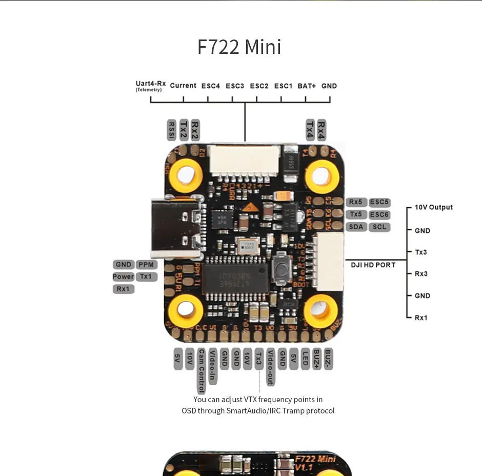 Польотний контролер T-HOBBY Mini F7 HD 3-6S з підтримкою OSD та перемикачем VTX (MPU6000) вирізняється легкою та компактною конструкцією при високій продуктивності. Версія Mini F7 HD легша та міцніша за стандартні контролери, оснащена 32-бітним керуванням та подвійним BEC для підключення без пайки (plug-and-play).