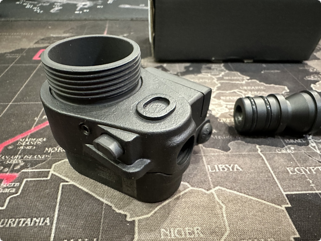 У конструкції адаптера є поворотне кріплення з системою фіксації, що дозволяє складати приклад вліво на 180 градусів і забезпечує фіксацію приклада в складеному стані.