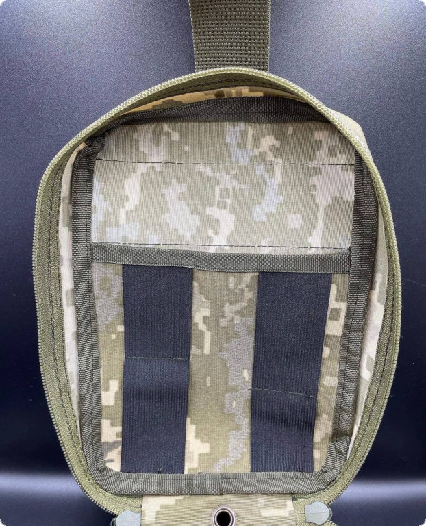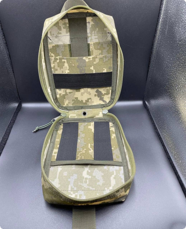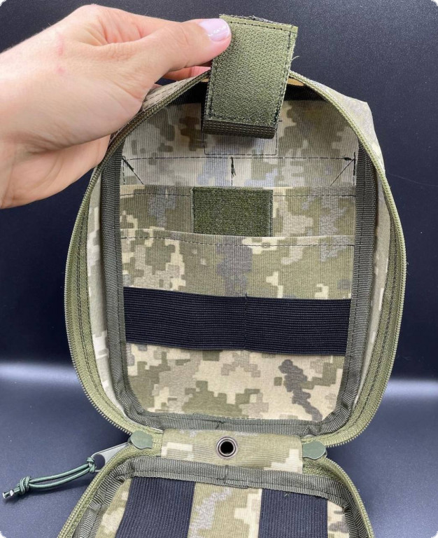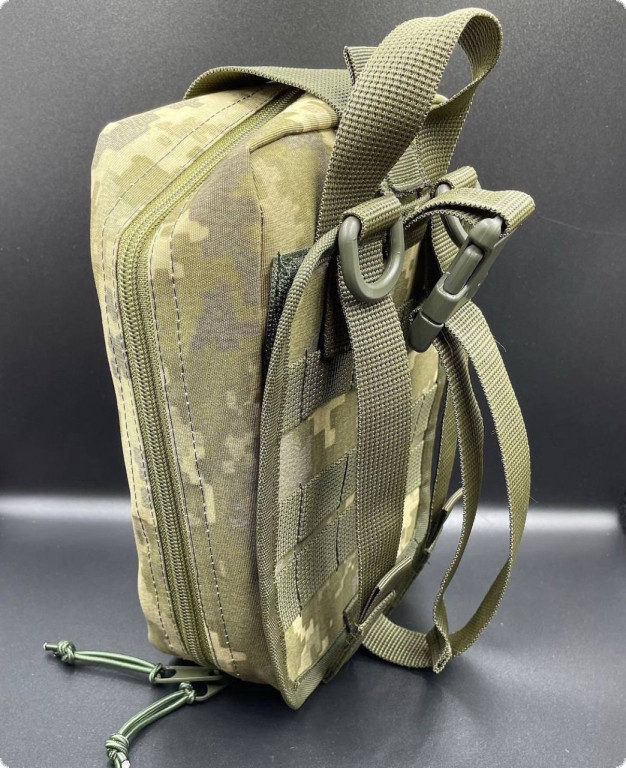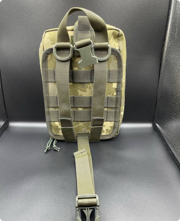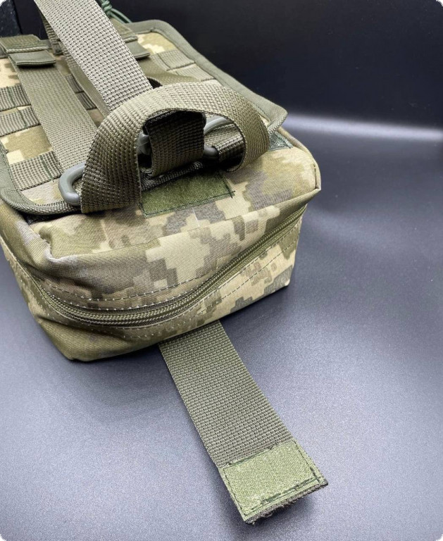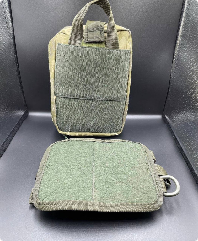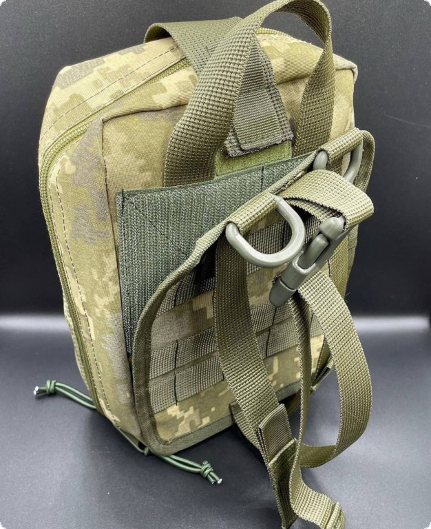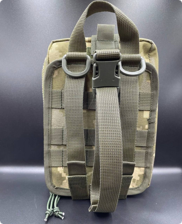 Тактична швидкознімна аптечка призначена для перенесення індивідуального набору засобів першої невідкладної допомоги. З передньої сторони велкро панель для кріплення ідентифікатора і 2 ряди кріплень MOLLE. Має ручку для зручного транспортування. З іншого боку 3 ряди кріплень MOLLE та додаткові прогалини для горизонтального розташування на легких страхових і розвантажуючих поясних ременях. Липучка дає можливість відділити модуль самої аптечки від шлейки, що дозволяє отримати доступ до необхідного вмісту. Всередині аптечки 2 внутрішні кишені і еластичні фіксуючі резинки. На дні люверс для стока води (довгий отвір) Розміри: Висота: 20/21 см Ширина: 14/15 см. Глибина: 8/9 см