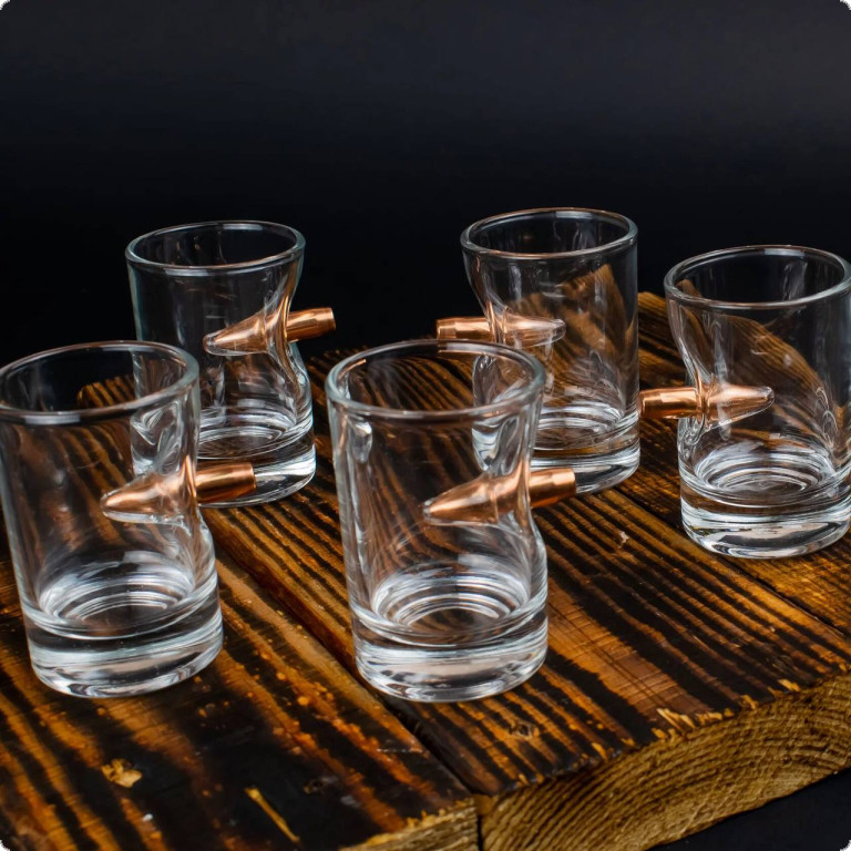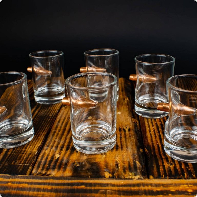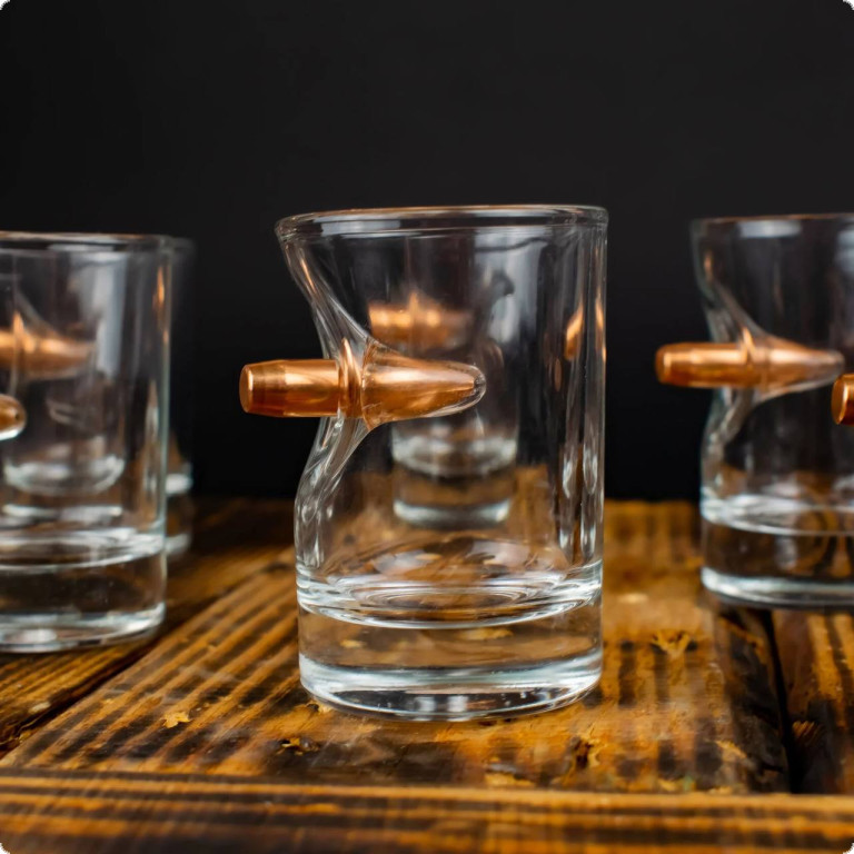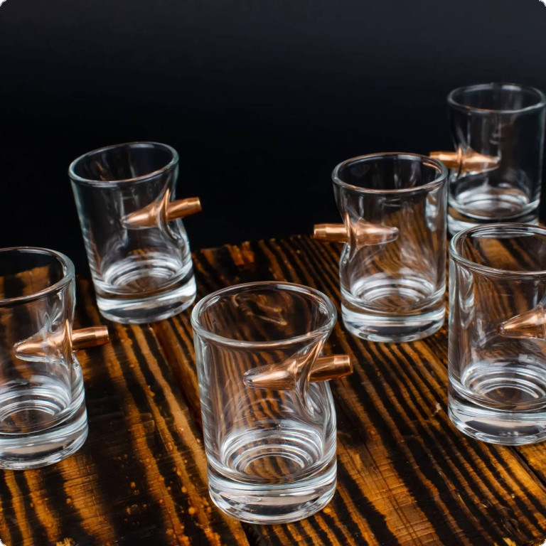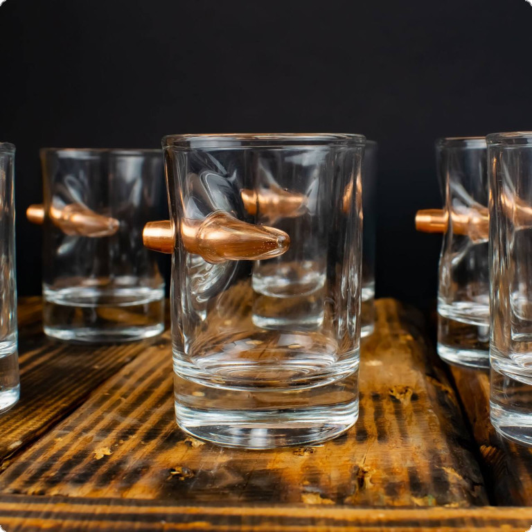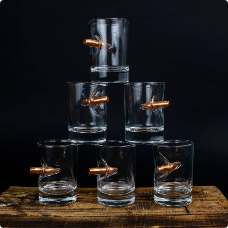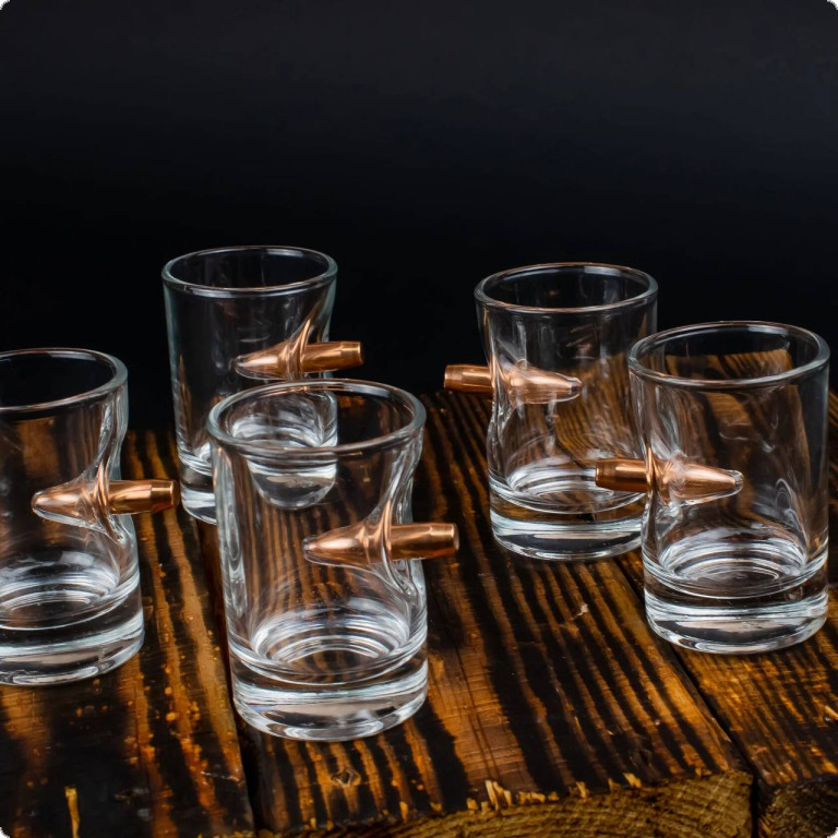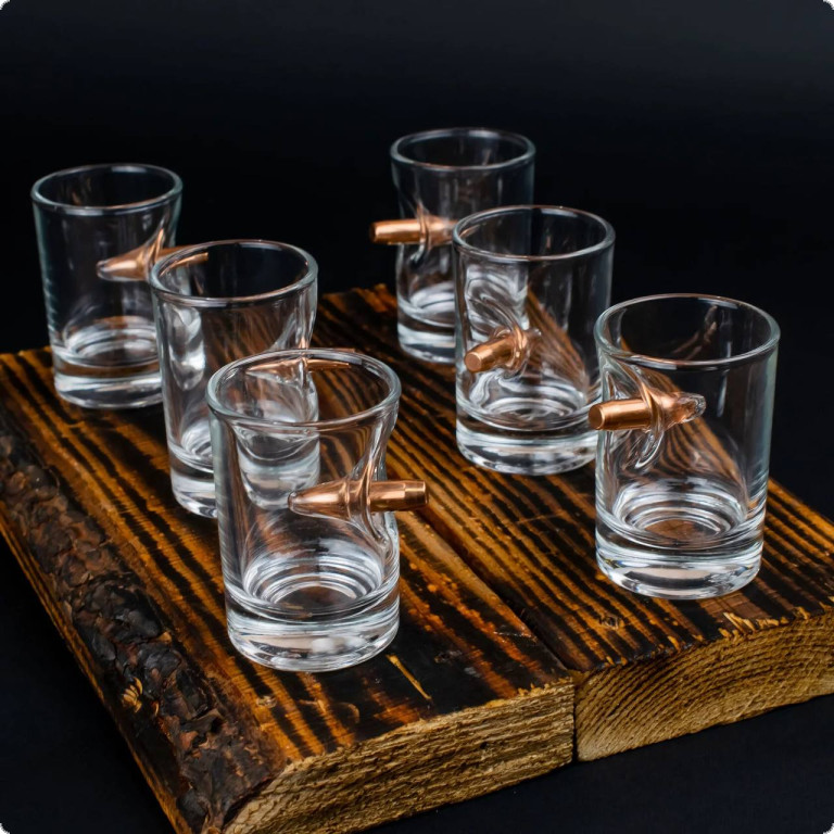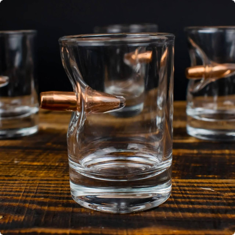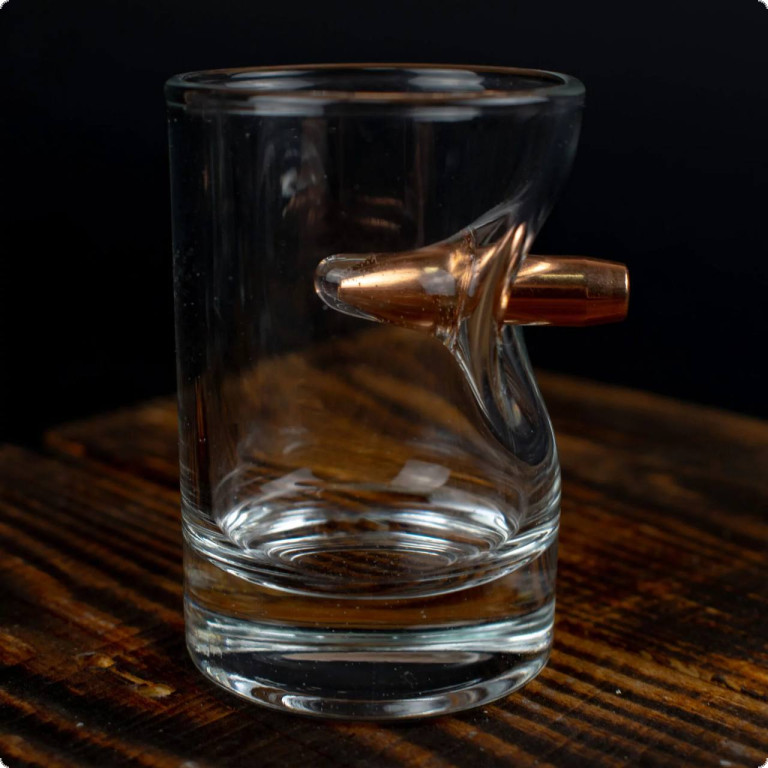 Чарка зі справжньою кулею 7.62 мм. - це той подарунок, який здатний здивувати. Куля, що наче пострілом пробиває скло і зупиняється в ньому, виглядає красиво і довершено. Наші майстри виготовляють ці чарки, прикладаючи усіх зусиль, аби ви могли дарувати неймовірні враження.